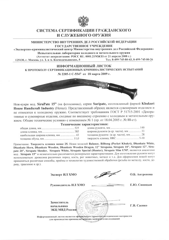 Не особо понимаю по каким характеристикам оценивать холодное оружие или нет . Если честно,то оружие холодней не придумаешь! А если вас интересует бумага к ножу ,то ДА ,бумагу прилагается ))Для образца,выкладываю похожу лицензию,родная не отсканирована.Конкретно интересует качество или бумага? Фирма которая произвела этот нож,является основным поставщиком армии Непала, как мне рассказывали мастера,для ножей берется центральная жила рессоры. Поскольку нож не кустарного ,а мастерового пр-ва от лицензированной фирмы,вопросов по качеству и легальности не должно остаться,я думаю. Вообще ,этот нож был представлен как эксклюзив и купить его можно было только в Катманду http://www.khukuriblades.com/products/details.php?id=323033fc4c1 на сайте написана твердость 22-25,но в бумаге написано совсем другое,тоже что и на образце! Чему верить? Я склонен верить информации на сайте ,т.к. знаю что такое бизнесс по русски)) |