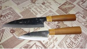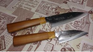 PUPSIN писал(a): Продам набор из двух ножей от японских кузнецов. Клинки покрыты лаком, с целью предохранения от коррозии. 3-х слойный ламинат внутренний слой (режущий) выполнен из твердой углеродистой стали SUJ-2 (Сталь конструкционная подшипниковая, аналог нашей ШХ15) сверху из SS41 (Сталь конструкционная углеродистая) Твердость: 62 HRC Двусторонняя заточка. Отличный рез, долго держат заточку. Большой Фунаюки длина~155мм, обух в середине ~1,9мм, ширина наибольшая ~45 Малый Овощной длина клинка ~100, обух в середине 1,7-1,8мм, ширина ~35 Рукояти из сувель березы и яблоня Цена 5000р продается только комплектом. Прошу блогеров не судить за фото,фотика у мну нету пользую телефон.